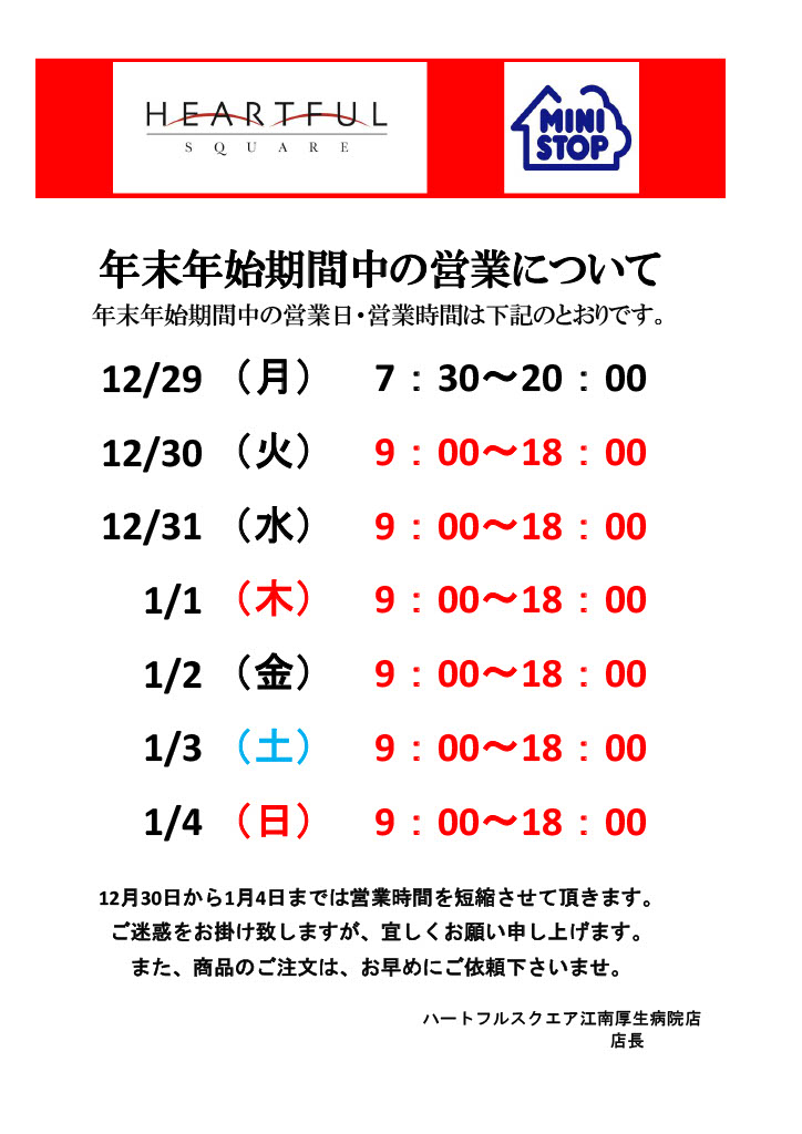 年末年始における売店の営業時間のお知らせ