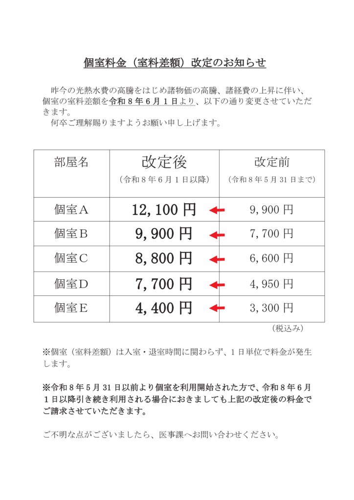 個室料金(室料差額)改定のお知らせ